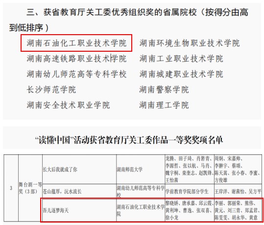 “读懂中国”活动由教育部关工委发起,省教育厅关工委承办。我校《吾儿逐梦海天》荣获湖南省教育厅关工委舞台剧一等奖;《闪闪发光的突击队精神》荣获湖南省教育厅关工委微视频二等奖;《致敬最可爱的人——李和初》荣获湖南省教育厅关工委微视频二等奖;在湖南省教育厅关工委征文中,《“荒货大爷”的家国情怀》《忆往昔峥嵘岁月,共话百年新时代》均荣获二等奖,其中,由大数据与人工智能学院教师党支部与学生党支部报送的作品《吾儿逐梦海天》《传承红色基因,致敬崇高灵魂》连续两年荣获一等奖。