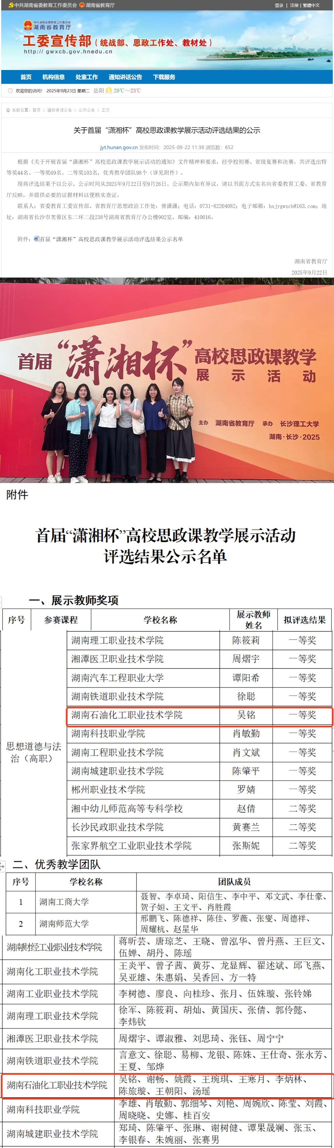 在湖南省首届“潇湘杯”高校思政课教学展示竞赛活动中,马克思主义学院吴铭老师荣获《思想道德与法治》组一等奖!马克思主义学院德法教学团队荣获省级优秀教学团队!