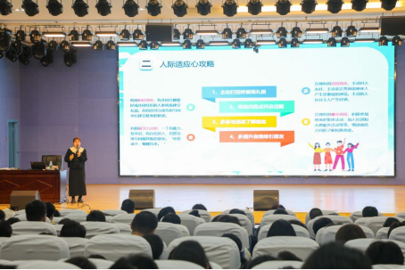 讲座由该校心理健康中心胡婕老师主讲,聚焦新生入学后面临的适应问题,从环境适应、学习适应、人际适应及心理适应四个方面展开系统阐述。胡婕老师结合学生实际情况,以通俗的语言解析适应过程中的常见困惑,提供应对思路与方法,内容贴近校园生活,引发在场学生广泛共鸣,现场气氛热烈融洽。