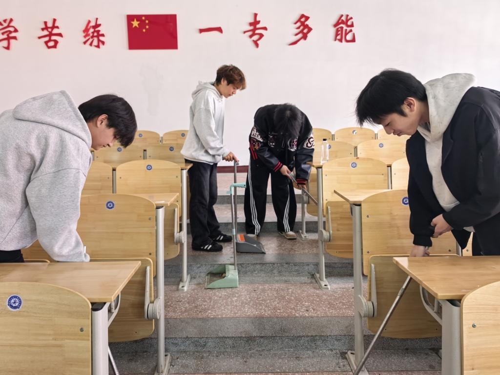 活动伊始,劳动教育专题任课教师对学生进行动员,结合学雷锋月主题,引导同学们理解奉献、友爱、互助、进步的志愿精神内涵,更将安全教育与劳动评价标准植入其中,确保了劳动过程的教育性与专业性。劳动现场,同学们化身“校园美容师”,根据地面清洁、桌椅擦拭、考场布置等专项小组奔赴考场与周边校园环境责任区。最后,教师对各小组完成情况进行了现场检查与评价,对个别细节问题及时指导整改。整洁规范的教室环境与井然有序的考场布局,充分展现了同学们良好的劳动素养和团队协作精神。