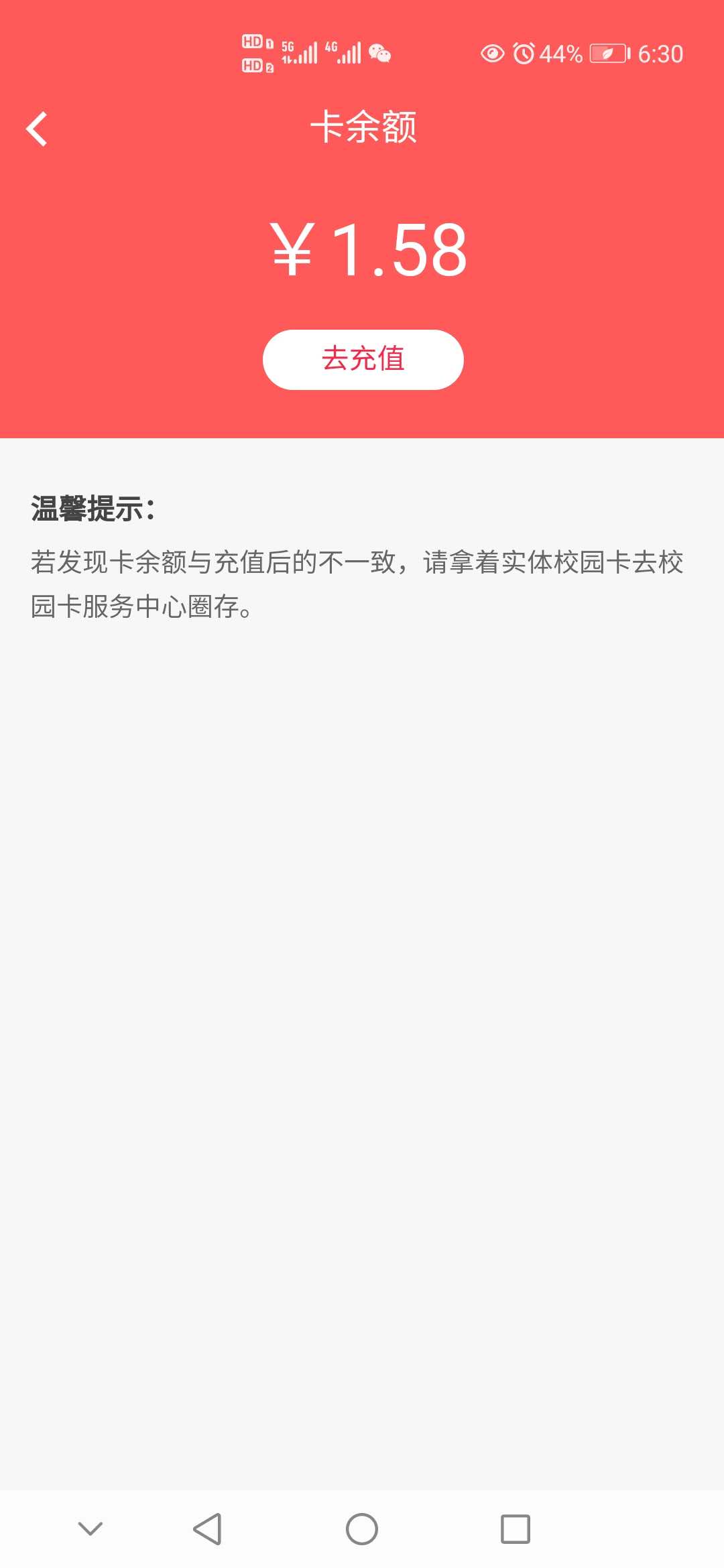 三、校园卡充值功能:绑卡成功后,点击首页“卡充值”,输入金额后点击充值,充值成功后校园卡余额立即到账。学生可在余额查询中查校园卡余额。