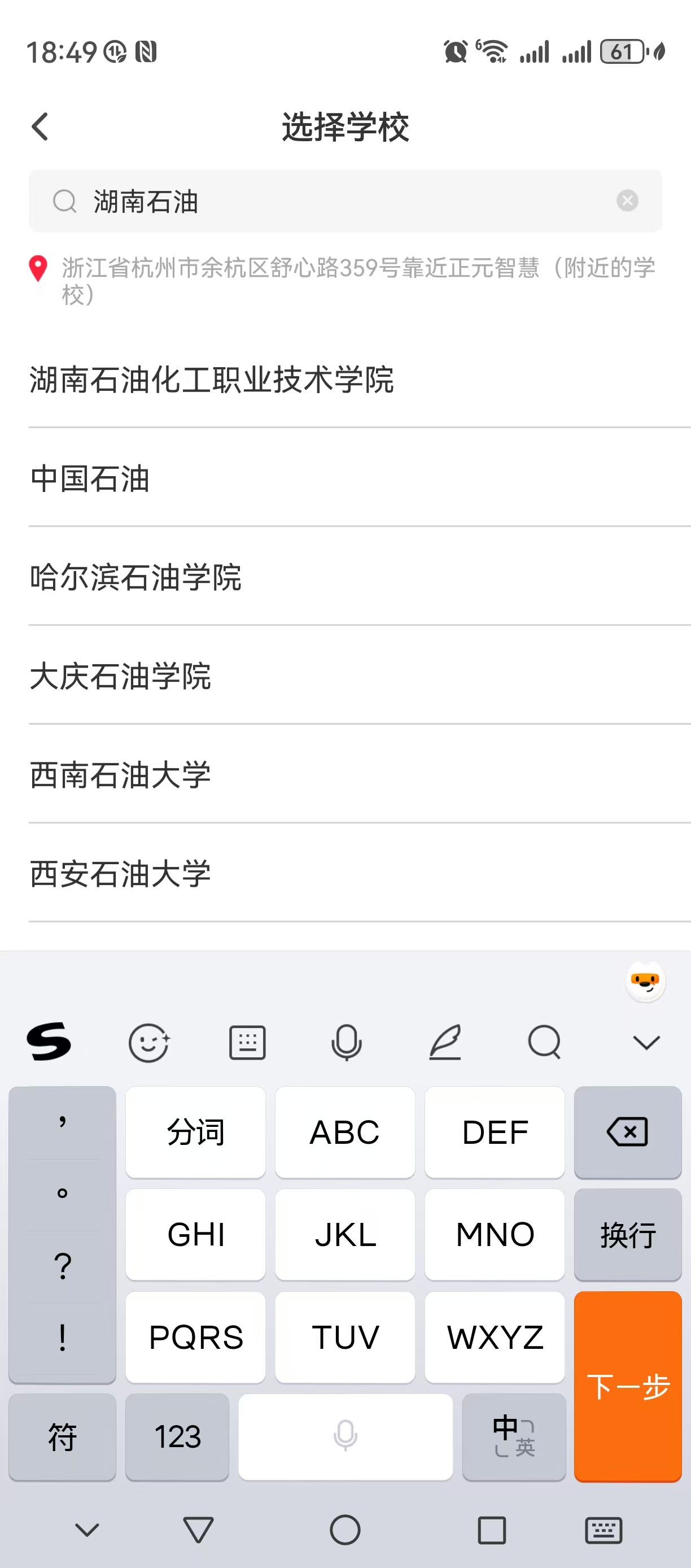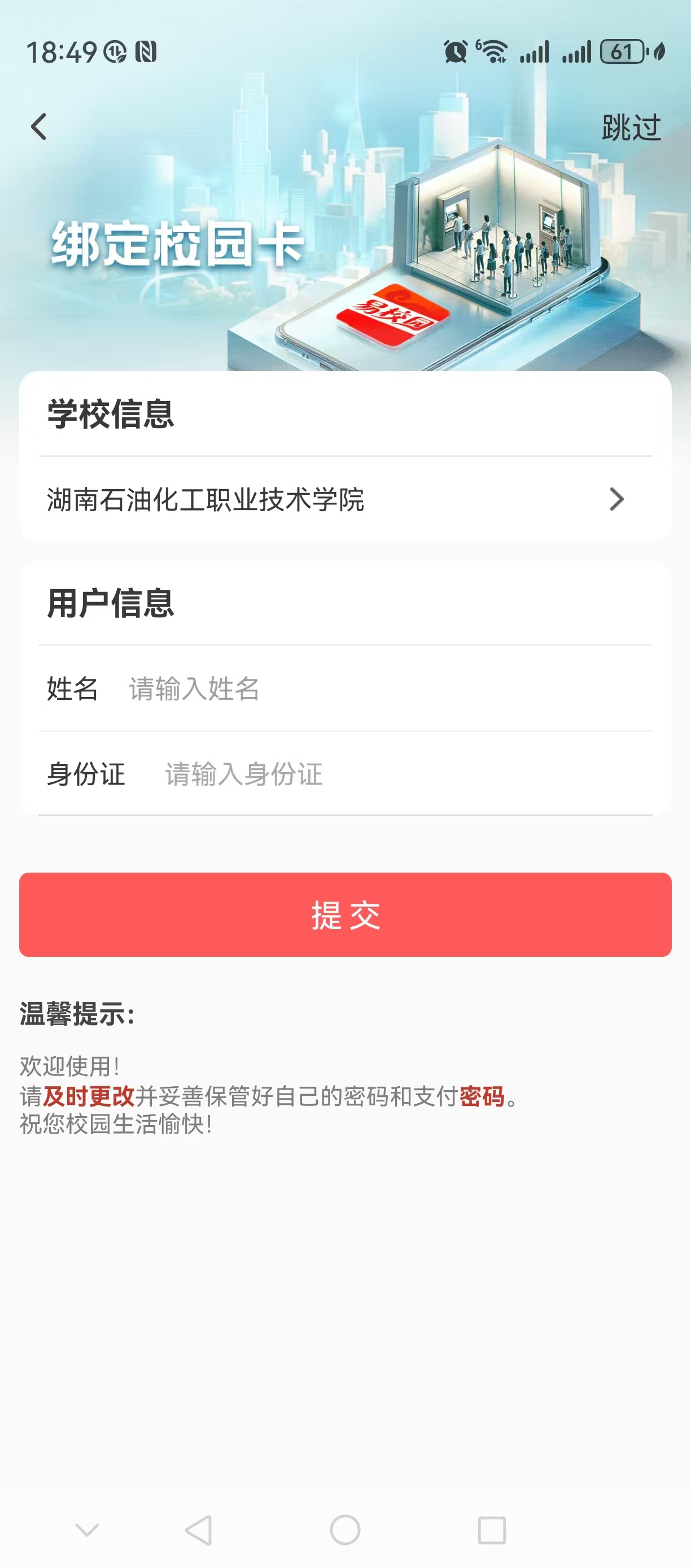 二、注册并绑卡流程:输入手机号码获取验证码完成注册,输入搜索“湖南石油化工职业技术学院”点击确认,选择学生身份,然后输入“姓名”“身份证”进行校园卡绑定,进入APP首页。