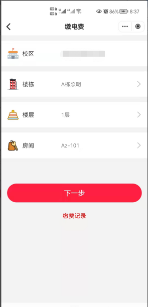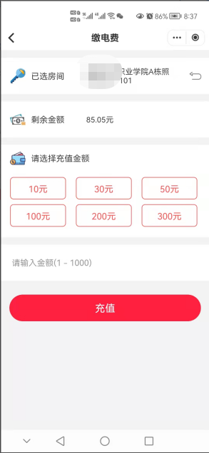 四、缴电费:打开首页“缴电费”功能,输入楼栋、楼层、房间号,最后点击“充值”。